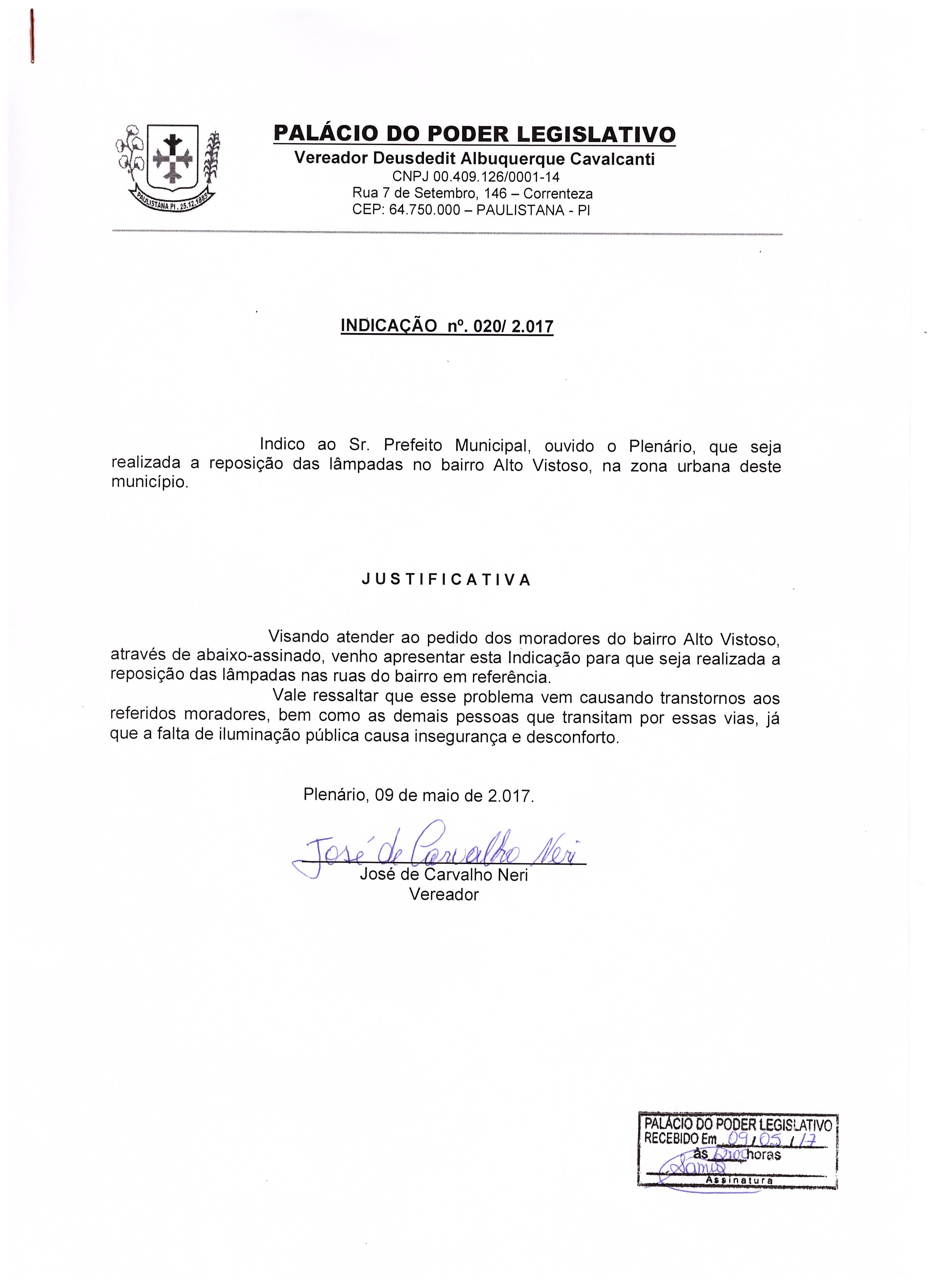 Confira a indicação nº 020/2017 de autoria do Vereador José de Carvalho Neri (PTB).